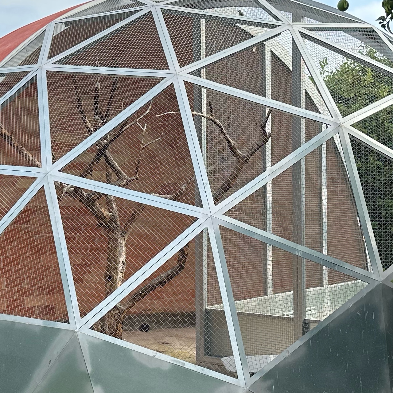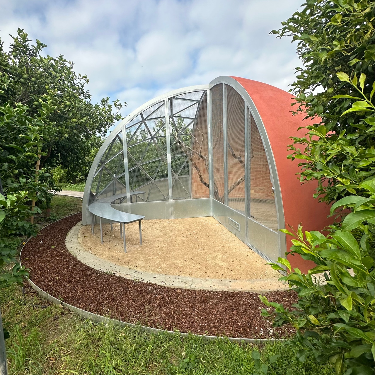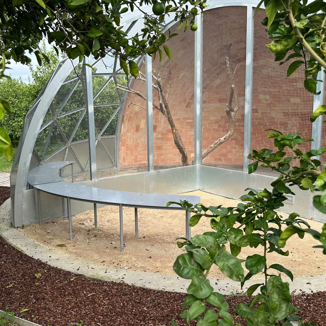 The piece combines a semi-dome of brick, in the Guastavino style, painted on the exterior with red ochre pigment, and a quarter of a geodesic dome made of galvanized steel and metal mesh. This structure allows light and air to enter, as well as the projection of the birds’ song beyond the enclosure. This permeability turns the aviary into an intermediate space between the built and the natural. Inside, a dried pomegranate tree provides multiple perching points for the songbirds that inhabit it, such as the European serin, linnet, European goldfinch, European robin, chaffinch, and European greenfinch—all species native to Valencian citrus landscapes.